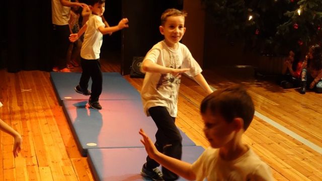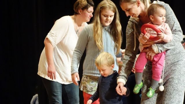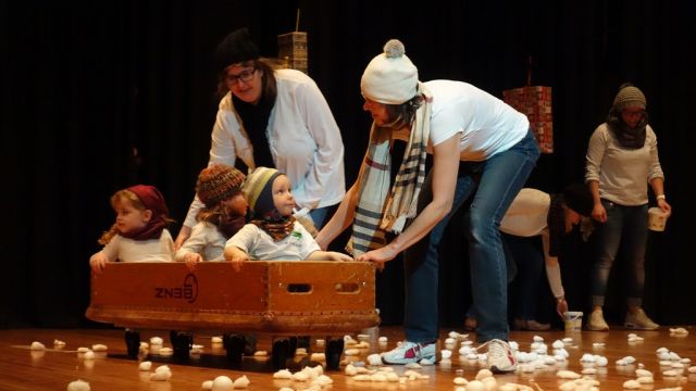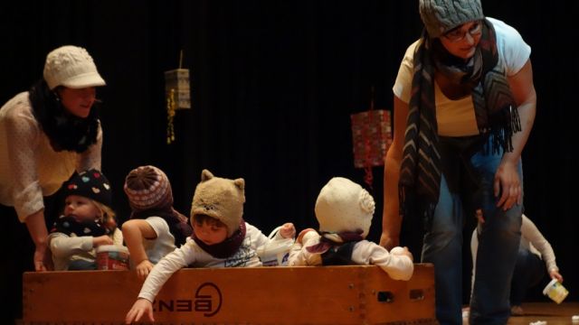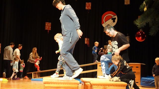 Die etwas größeren Kinder aus Ingrid Döblers Eltern-Kind-Gruppe bewältigten mit Mamas oder Papas Hilfe zu einem passenden Nikolauslied den Parcours mit Mini-Kästen und erhielten viel Beifall. Die Kleinsten der Eltern-Kind-Gruppe zeigten rechtzeitig zu dem um die Jahnhalle tatsächlich eintretenden Schneefall den Programmpunkt „Es schneit“ und hatten einen gelungenen Auftritt