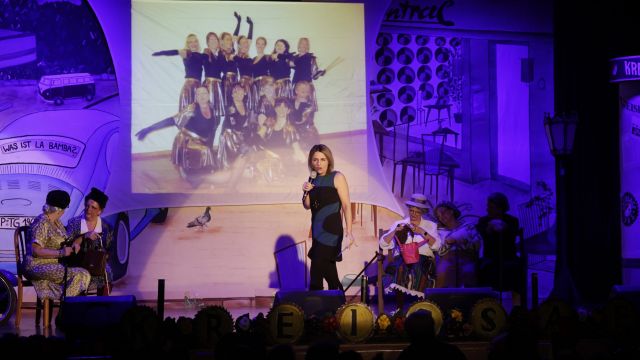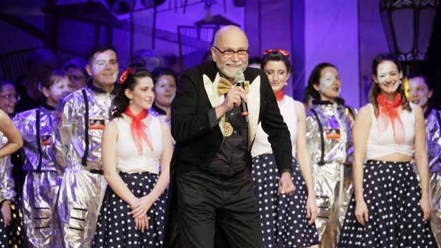 Der zweite Teil wurde eindrucksvoll durch die Wettkampfgymnastik mit einem stimmungsgeladenen Medley der 60er und schicken Petticoats eröffnet, ehe der “Altenstädter und sei Reigschmegda” als “Volksfront von Altenstadt” ihre Sicht der Dinge gekonnt darlegten. Anschließend brachten dann die “Schnaddergoißa” die Jahnhalle zum Toben: verkleidet als alte Damen schwangen sie ihr Tanzbein zu “Thriller” und “Stayin Alive”. Klim-Bim-Palinka-Plim begeisterte dann mit dem “Ring ohne Weiler“ und verabschiedete nach 16 tollen Auftritten den Kreissäge “Professor” Dr. Werner Ziegler in den Ruhestand. Das Finale wurde traditionell vom Cancan der Wettkampfgymnastik eröffnet, bevor die Mitwirkenden nochmals die Bühne betraten. Anlässlich des 60jährigen Jubiläums der Kreissäge, kamen die Ordensträger aus sechs Jahrzehnten auf die Bühne und schunkelten auf der vollen Jahnhallenbühne zum Sägewalzer.