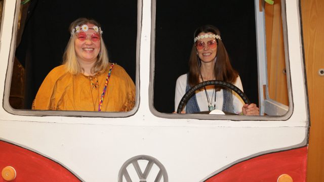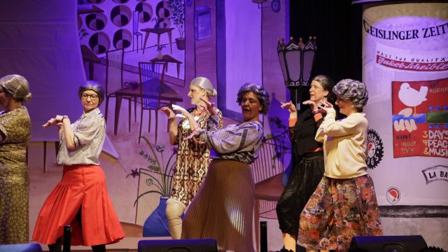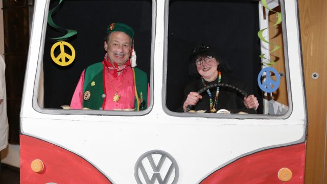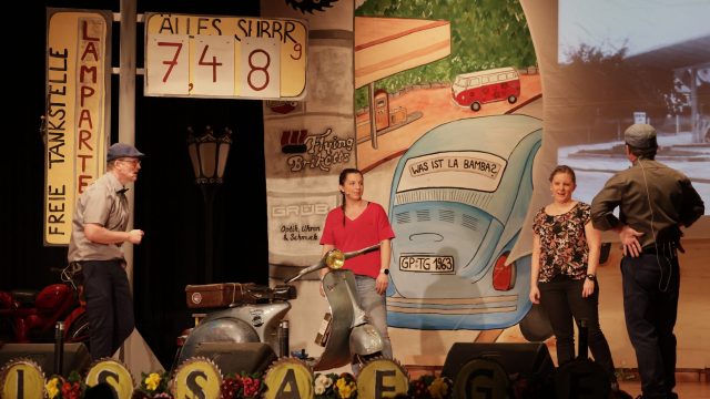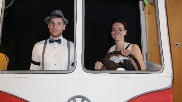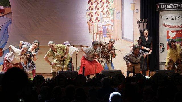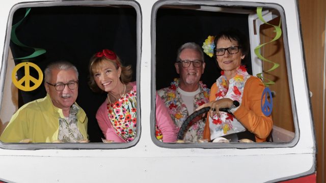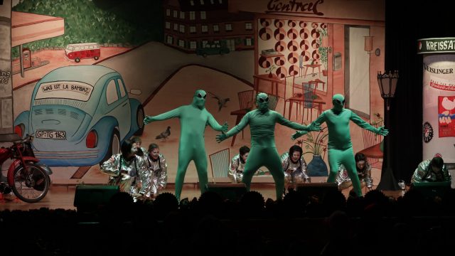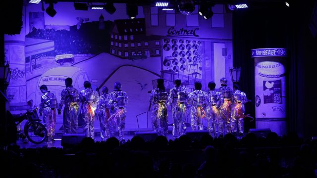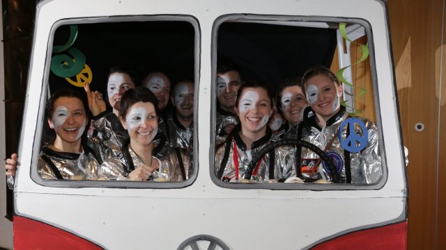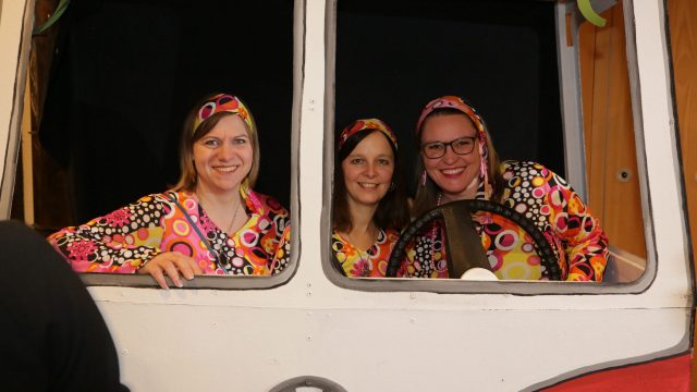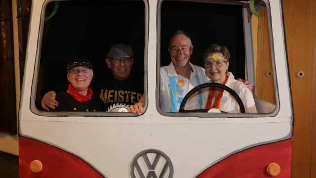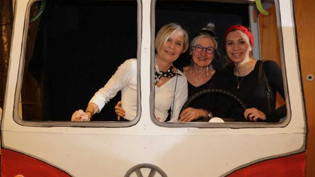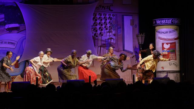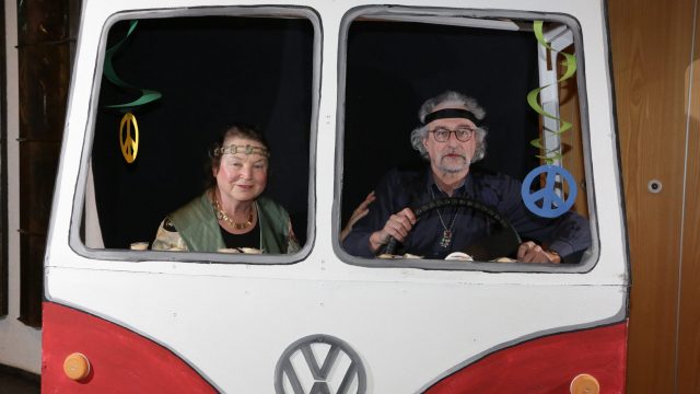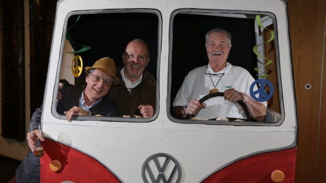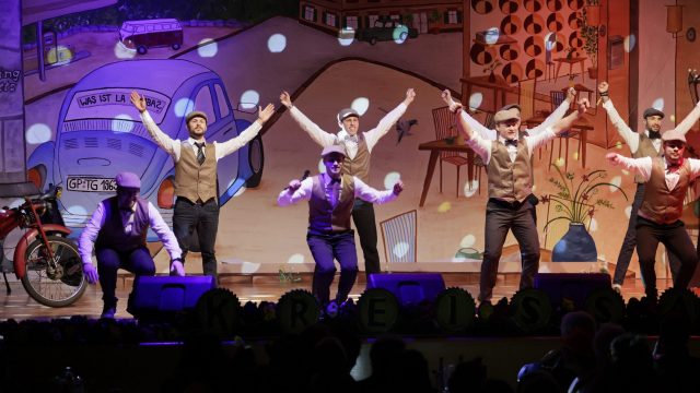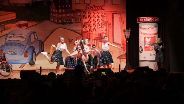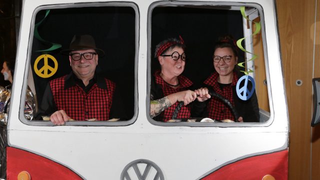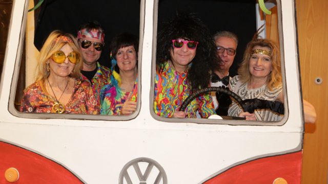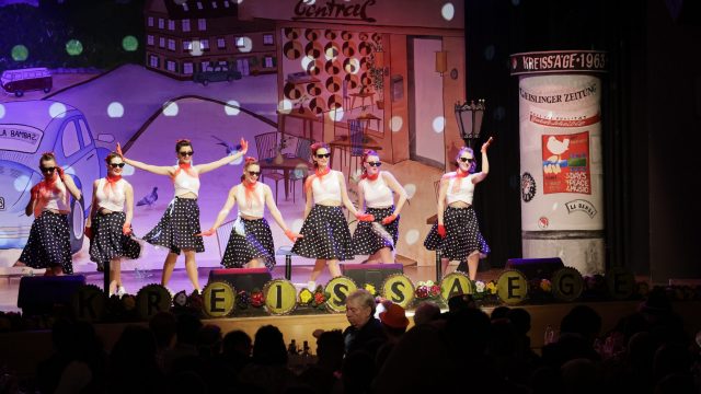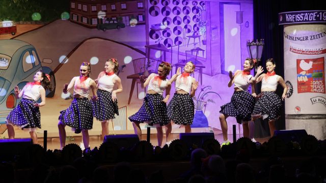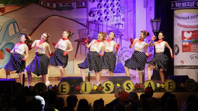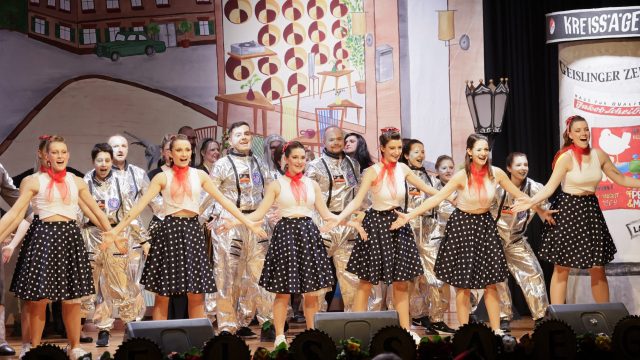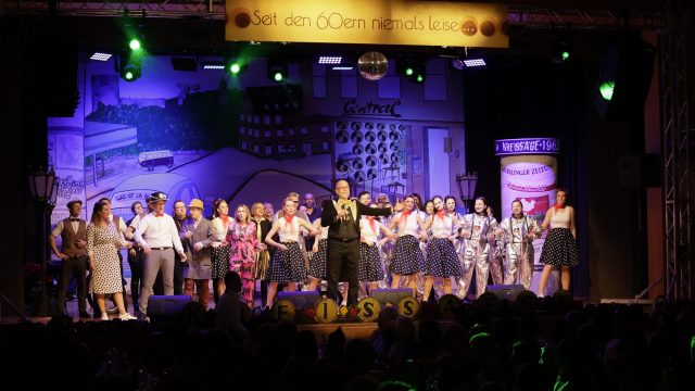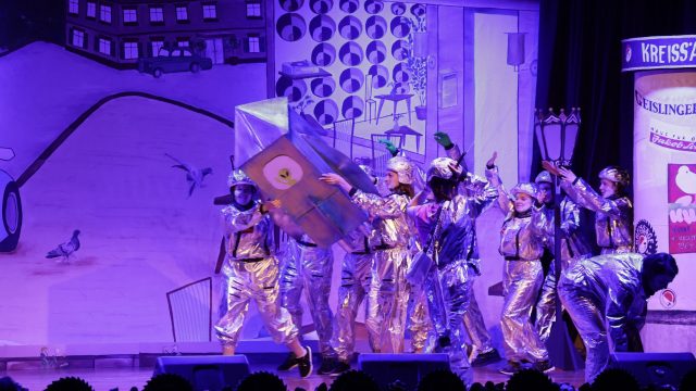 Am Wochenende war es endlich wieder soweit! Nach drei langen Jahren verwandelte die Kreissäge die Jahnhalle wieder in ein buntes Tollhaus. Schon seit Wochen war die Jahnhalle an beiden Abenden ausverkauft! Stilecht, mit 60er Jahre Bulli, wurden die Besucher im Foyer begrüßt. Eine Fotowand zeigte einen Rückblick in die Vergangenheit bis zur ersten Stunde der Kreissäge und die stilvoll geschmückte Halle ließ die Vorfreude noch höher steigen. Und schon ging es los: Sascha Binder, als Peter Prause der Hausmeister der Jahnhalle, wurde durch die Mitwirkenden in seinem Tun gestört, als diese die Bühne zu den Klängen von “La Bamba” stürmten. Das Bühnenbild ließ die Zuschauer in die Fuzo der 60er eintauchen und “Bax” Wagner gab den Sägewalzer zum ersten Mal seit drei Jahren wieder zum Besten. “Rio d`Oro” brachte Woodstock auf den Helfenstein und viel Stimmung in die Halle. Eine super Kreissäge-Premiere hatte die Gruppe Fit & Fun – sie erinnerte mit einer tollen Choreo an die Mondlandung – inklusive Aliens, die es sich nicht nehmen ließen mitzutanzen. “Anton aus dem All” legte humoristisch die Gründe dar, warum eine Gruppe Türkheimer in den sechziger Jahren ins All aufbrach, bevor das Männerballett an den ersten Kaffeevollautomaten der WMF erinnerte, und anschließend den Kaffee natürlich auch stilecht servierte. Und als dann “Bax und Spatzl” ihre ehelichen Diskrepanzen mit Gitarre und tollen Stimmen unter vielen Lachern zum Besten gaben, war den Zuschauern zur Pause schon klar: die Kreissäge rotiert wie eh und je!