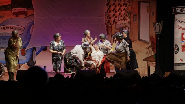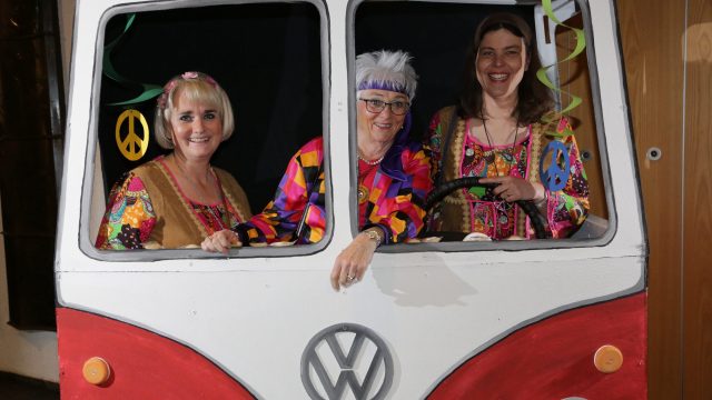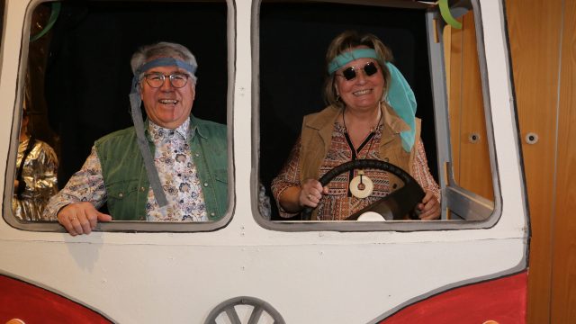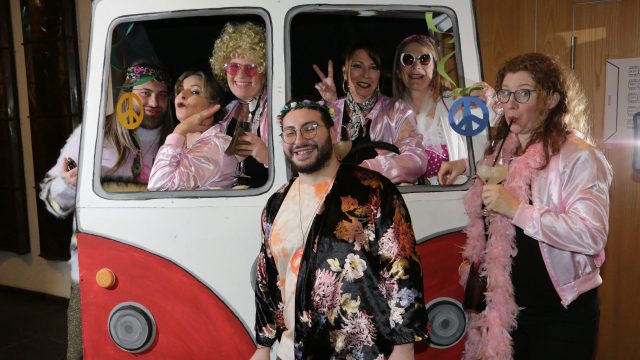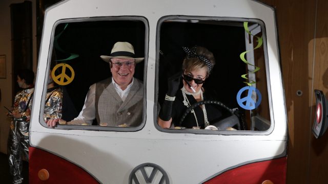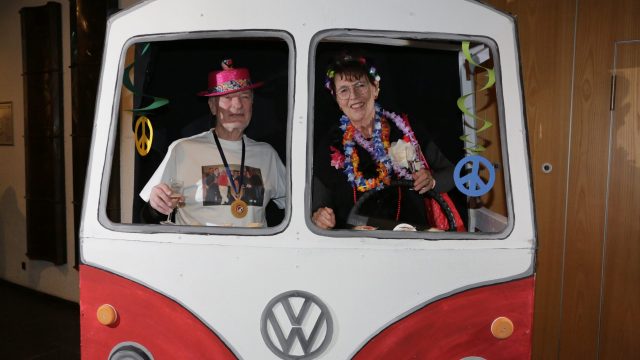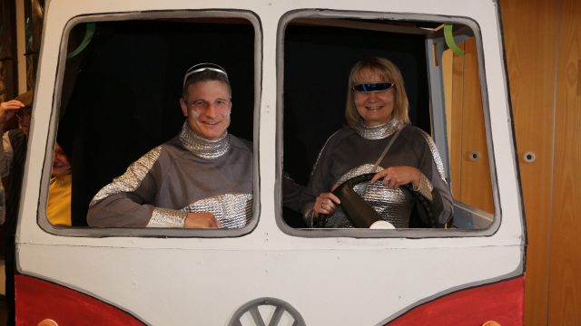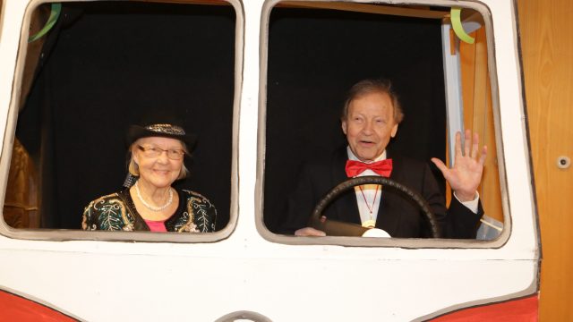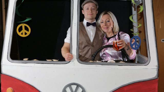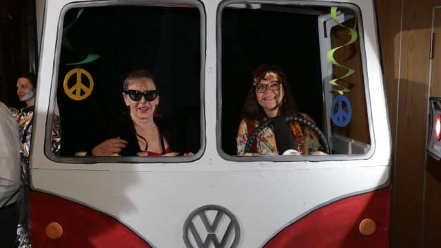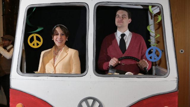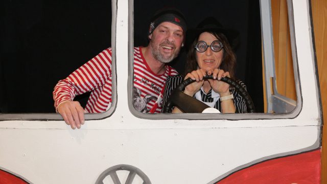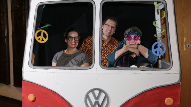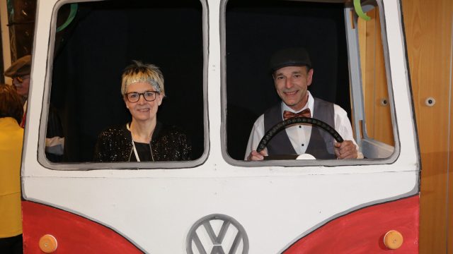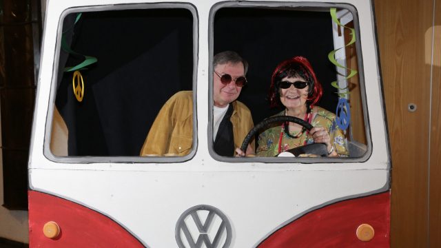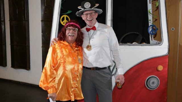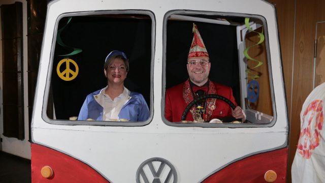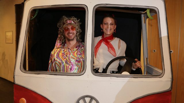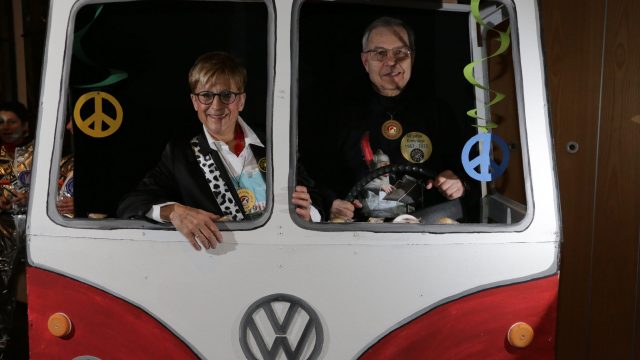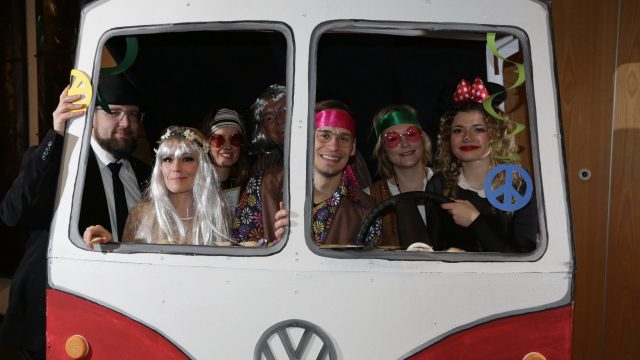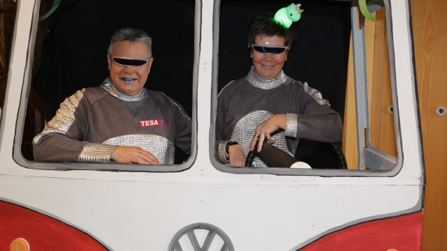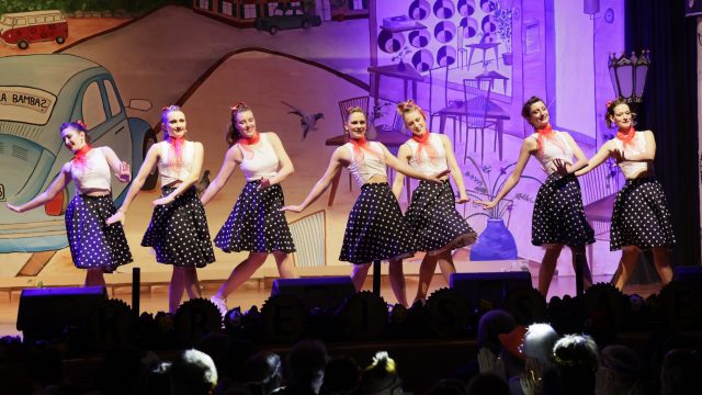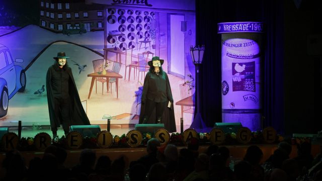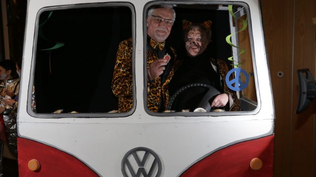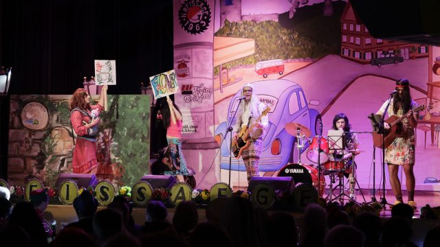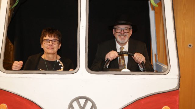 Am Wochenende war es endlich wieder soweit! Nach drei langen Jahren verwandelte die Kreissäge die Jahnhalle wieder in ein buntes Tollhaus. Schon seit Wochen war die Jahnhalle an beiden Abenden ausverkauft! Stilecht, mit 60er Jahre Bulli, wurden die Besucher im Foyer begrüßt. Eine Fotowand zeigte einen Rückblick in die Vergangenheit bis zur ersten Stunde der Kreissäge und die stilvoll geschmückte Halle ließ die Vorfreude noch höher steigen. Und schon ging es los: Sascha Binder, als Peter Prause der Hausmeister der Jahnhalle, wurde durch die Mitwirkenden in seinem Tun gestört, als diese die Bühne zu den Klängen von “La Bamba” stürmten. Das Bühnenbild ließ die Zuschauer in die Fuzo der 60er eintauchen und “Bax” Wagner gab den Sägewalzer zum ersten Mal seit drei Jahren wieder zum Besten. “Rio d`Oro” brachte Woodstock auf den Helfenstein und viel Stimmung in die Halle. Eine super Kreissäge-Premiere hatte die Gruppe Fit & Fun – sie erinnerte mit einer tollen Choreo an die Mondlandung – inklusive Aliens, die es sich nicht nehmen ließen mitzutanzen. “Anton aus dem All” legte humoristisch die Gründe dar, warum eine Gruppe Türkheimer in den sechziger Jahren ins All aufbrach, bevor das Männerballett an den ersten Kaffeevollautomaten der WMF erinnerte, und anschließend den Kaffee natürlich auch stilecht servierte. Und als dann “Bax und Spatzl” ihre ehelichen Diskrepanzen mit Gitarre und tollen Stimmen unter vielen Lachern zum Besten gaben, war den Zuschauern zur Pause schon klar: die Kreissäge rotiert wie eh und je!