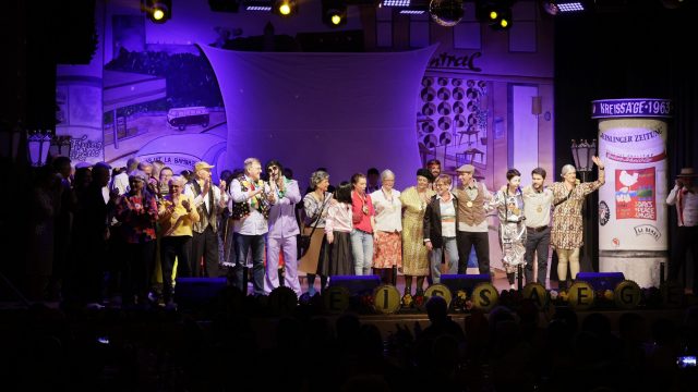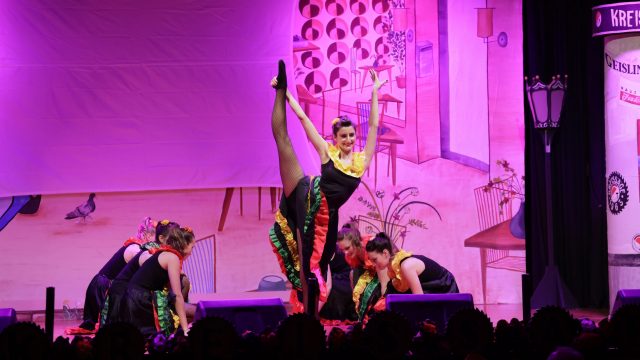Der zweite Teil wurde eindrucksvoll durch die Wettkampfgymnastik mit einem stimmungsgeladenen Medley der 60er und schicken Petticoats eröffnet, ehe der “Altenstädter und sei Reigschmegda” als “Volksfront von Altenstadt” ihre Sicht der Dinge gekonnt darlegten. Anschließend brachten dann die “Schnaddergoißa” die Jahnhalle zum Toben: verkleidet als alte Damen schwangen sie ihr Tanzbein zu “Thriller” und “Stayin Alive”. Klim-Bim-Palinka-Plim begeisterte dann mit dem “Ring ohne Weiler“ und verabschiedete nach 16 tollen Auftritten den Kreissäge “Professor” Dr. Werner Ziegler in den Ruhestand. Das Finale wurde traditionell vom Cancan der Wettkampfgymnastik eröffnet, bevor die Mitwirkenden nochmals die Bühne betraten. Anlässlich des 60jährigen Jubiläums der Kreissäge, kamen die Ordensträger aus sechs Jahrzehnten auf die Bühne und schunkelten auf der vollen Jahnhallenbühne zum Sägewalzer.