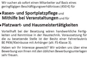 Wir suchen zur Erweiterung unseres Teams ab sofort einen Mitarbeiter auf Basis eines geringfügigen Beschäftigungsverhältnisses (450 €) für Rasen- und Sportplatzpflege und Mithilfe bei Veranstaltungen und für Platzwart- und Hausmeistertätigkeiten Vorteilhaft bei der Besetzung wären handwerkliche Fertigkeiten und Kenntnisse in […]