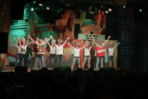 Und kurze Zeit später schon zogen die Mitwirkenden mit ihrem Line-Dance die Zuschauer in ihren Bann: Die 60. Kreissäge war gestartet! Rio d´Oro gestaltete das Clochard in einen Saloon um und mahnte: “Kopf einschalten beim Wählen”. Donald Trump – alias Bernd Anton, erntete viel Applaus für seinen “zehn Punkte Aktionsplan für Geislingen”, bevor es die “Schnaddergoisa” tänzerisch nach Las Vegas zum Junggesellinnenabschied zog.