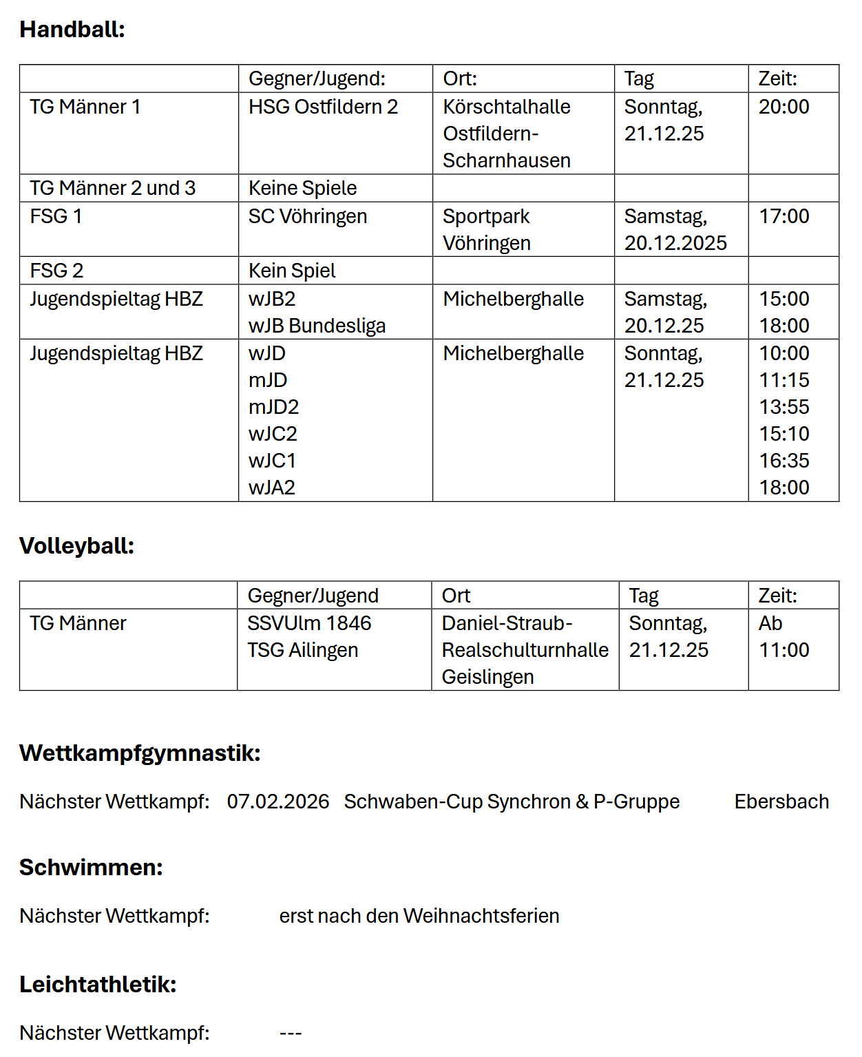 Wettkämpfe und Spiele am Wochenende: 20. + 21. Dezember 2025